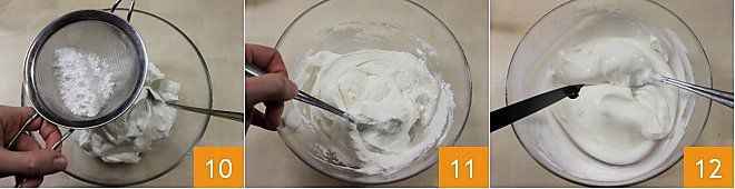 Jetzt bereiten Sie die Cremes für die Füllung vor. Für die Joghurtcreme: In eine Schüssel geben Sie 500 g griechischen Joghurt und fügen den gesiebten Puderzucker hinzu 10, mischen Sie, um die Zutaten zu vereinen 11, schneiden Sie die halbe Vanilleschote auf und fügen Sie die Samen hinzu 12, dann mischen Sie die Mischung.