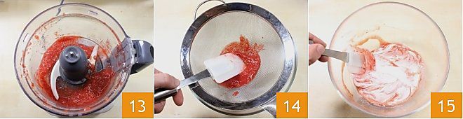 Für die Erdbeercreme: Verfahren Sie wie für die Joghurtcreme, geben Sie also 500 g griechischen Joghurt in eine Schüssel und fügen Sie den gesiebten Puderzucker hinzu, indem Sie die Zutaten mischen. Waschen Sie die Erdbeeren, entfernen Sie den grünen Stiel mit einem kleinen Messer und pürieren Sie sie 13, bis Sie ein feines Mark erhalten, das Sie mit einem feinen Sieb filtern 14. Nun fügen Sie das gefilterte Mark zum griechischen Joghurt hinzu und mischen es gründlich mit einem Spatel oder Löffel 15.