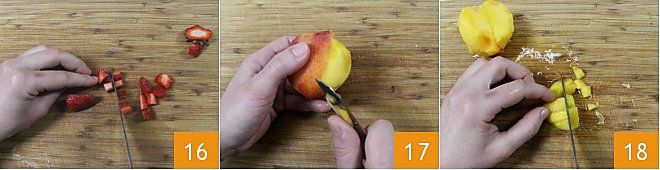 Bereiten Sie jetzt das Obst für die Füllung vor: Waschen Sie die Erdbeeren, entfernen Sie den Stiel und schneiden Sie sie in kleine Würfel 16. Schälen Sie die Pfirsiche mit einem kleinen Messer 17, schneiden Sie sie in zwei Hälften, um den Kern zu entfernen, und schneiden Sie sie dann in kleine Würfel 18. Dasselbe tun Sie auch mit den Aprikosen.