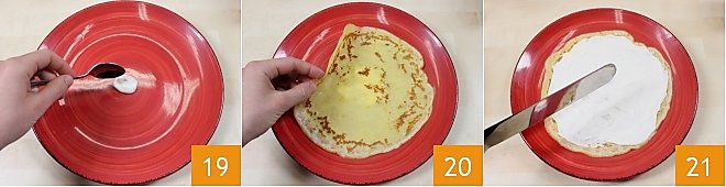 Jetzt können Sie beginnen, Ihre Torte zusammenzustellen: Nehmen Sie eine Servierplatte und streichen Sie etwas Joghurtcreme auf den Boden der Platte, damit die Crêpe, die als Basis dient, nicht verrutscht 19. Legen Sie die erste Crêpe 20 und verteilen Sie etwa zwei Esslöffel weiße Joghurtcreme darauf 21.
