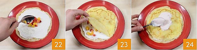 Fügen Sie einen Esslöffel Obstwürfel hinzu 22 und verteilen Sie sie auf der gesamten Oberfläche, dann decken Sie die Schicht mit einer weiteren Crêpe ab 23. Bestreichen Sie diese Crêpe dann mit etwa 2 Esslöffeln Erdbeercreme 24 und verteilen Sie die Obstwürfel wie in der vorherigen Schicht.