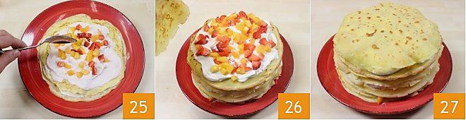 Verfahren Sie dann auf die gleiche Weise (25-26), indem Sie die Joghurt- und Erdbeercremes abwechseln, bis Sie die Torte mit der letzten Crêpe-Schicht fertiggestellt haben 27.