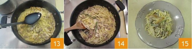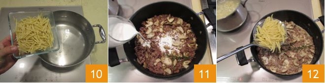 Sobald das Wasser die richtige Temperatur hat, geben Sie die Trofie hinein 10, währenddessen gießen Sie die Sahne in die Pfanne mit der Sauce und reiben noch eine Prise Pfeffer darüber 11, sobald die Trofie gekocht sind, lassen Sie sie in den Topf abtropfen 12.