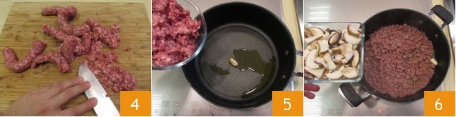 Gehen Sie zur Zubereitung über. In einem Topf erhitzen Sie einen Schuss Olivenöl und lassen eine in der Schale belassene Knoblauchzehe darin Aroma geben. Sobald der Boden heiß ist, geben Sie die Wurst hinzu, die zuvor von der Haut befreit und zerkrümelt wurde 4. Lassen Sie das Fleisch sanft anbraten und erhöhen Sie dann die Hitze, bevor Sie die Pilze hinzufügen 5. Braten Sie diese auch kurz an und entfernen Sie den Knoblauch, sobald die Pilze ihre Flüssigkeit abgeben 6.