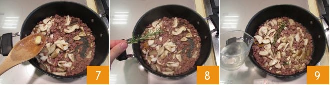 Aromen Sie mit einem Zweig Rosmarin, den Sie abblättern 7. Einige Minuten später wird die Flüssigkeit verdampft sein, was bedeutet, dass es Zeit ist, mit Weißwein abzulöschen 8. Würzen Sie mit Salz und Pfeffer, reduzieren Sie die Temperatur und bringen Sie das Wasser für die Pasta zum Kochen 9.