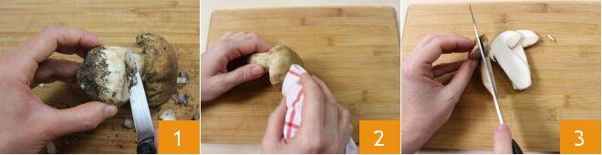 Um die Trofie mit Wurst und Pilzen zuzubereiten, beginnen Sie mit der Reinigung der Pilze. Zuerst schneiden Sie den Basisansatz ab und entfernen den erdigen Teil 1. Dann wischen Sie den gesamten Pilz vorsichtig mit einem feuchten Tuch ab, bei Bedarf empfehlen wir auch die Verwendung einer speziellen Bürste 2. Wenn sie alle sauber sind, schneiden Sie die Pilze in wenige Millimeter dicke Scheiben 3.