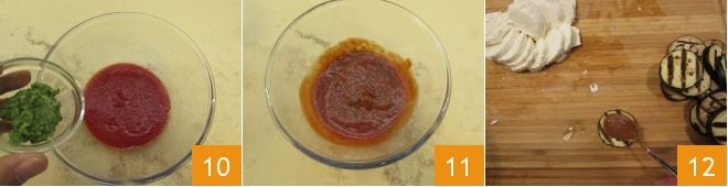 Gießen Sie das Tomatenpüree in eine Schüssel, fügen Sie das Pesto hinzu 10 und mischen Sie alles mit einem Löffel 11. Jetzt sind alle Zutaten bereit und Sie müssen nur noch Ihre Auberginen-Türmchen zusammensetzen. Nehmen Sie eine erste gegrillte Aubergine, fügen Sie einen Teelöffel Pesto-Soße hinzu 12