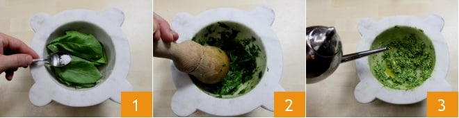 Um die Auberginen- und Mozzarella-Türmchen vorzubereiten, können Sie mit der Zubereitung des Pestos beginnen, das mit der Tomatensauce kombiniert wird (wenn Sie bereits hausgemachtes Pesto haben, können Sie 120 g verwenden). Das Verfahren finden Sie hier: Pesto alla Genovese. Reinigen Sie die Basilikumblätter mit einem weichen Tuch. In einem Mörser (falls nicht vorhanden, können Sie einen Mixer für den gesamten Vorgang verwenden) geben Sie den geschälten Knoblauch zusammen mit ein paar Körnern grobem Salz und beginnen zu zerstoßen. Wenn der Knoblauch zu einer Creme geworden ist, fügen Sie die Basilikumblätter zusammen mit einer Prise grobem Salz hinzu 1. Zerdrücken Sie dann das Basilikum gegen die Wände des Mörsers, indem Sie den Stößel von links nach rechts drehen und gleichzeitig den Mörser in die entgegengesetzte Richtung drehen 2. Fahren Sie fort, bis aus den Basilikumblättern eine leuchtend grüne Flüssigkeit austritt; dann fügen Sie die Pinienkerne hinzu und beginnen erneut zu zerstoßen, um alles in eine Creme zu verwandeln. Fügen Sie nach und nach die Käsesorten hinzu, rühren Sie ständig um und zuletzt das Olivenöl extra vergine in einem dünnen Strahl 3. Vermischen Sie die Zutaten gut, bis eine homogene Sauce entsteht. Jetzt, da das Pesto fertig ist, stellen Sie es beiseite.