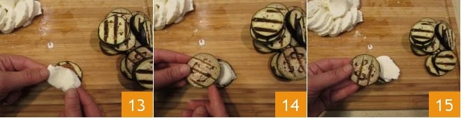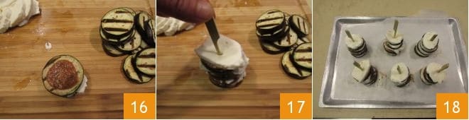 und platzieren Sie eine Scheibe Mozzarella darauf 13. Decken Sie erneut mit einer gegrillten Aubergine ab 14 und wiederholen Sie den Vorgang noch zweimal 15; insgesamt müssen Sie drei Schichten mit vier Auberginenscheiben herstellen.