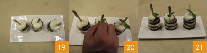 Sobald die letzte Auberginenscheibe platziert ist, beenden Sie mit einem Teelöffel Tomatenpüree 16, einer Scheibe Mozzarella und durchbohren Sie das Türmchen mit einem Zahnstocher, um alle Schichten miteinander zu verbinden 17. Legen Sie die Türmchen auf ein mit Backpapier ausgelegtes Backblech 18 und backen Sie sie im vorgeheizten statischen Ofen bei 200 °C für 10 Minuten.