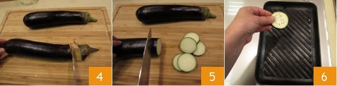 Fahren Sie mit der Zubereitung der Auberginen fort: Waschen Sie sie und entfernen Sie die Enden 4, dann schneiden Sie die Auberginen in etwa 1 cm dicke Scheiben 5. Stellen Sie eine Grillpfanne auf den Herd und wenn sie heiß ist, legen Sie die Auberginenscheiben darauf 6.