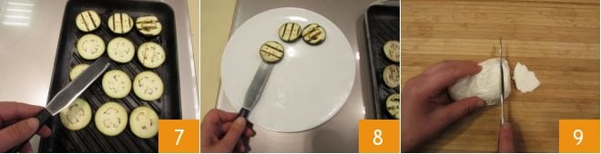 Warten Sie etwa 3 Minuten und wenn die Auberginen gut gebräunt sind, wenden Sie sie und setzen Sie das Garen für weitere 3 Minuten fort. Sobald sie gegrillt sind, legen Sie die Auberginen auf einen Teller 8 und stellen sie für einen Moment beiseite. Schneiden Sie nun den Mozzarella in 0,5 cm dicke Scheiben 9 und legen Sie auch diese beiseite in ein Sieb, falls der Mozzarella sehr nass sein sollte.