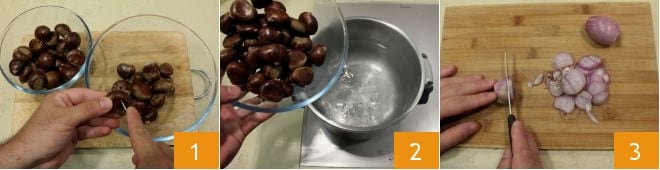 Um die Samtsuppe aus Kastanien mit Steinpilzen und knusprigem Schweinebacke zuzubereiten, beginnen Sie damit, einen Topf mit Wasser für die Zubereitung der Gemüsebrühe auf den Herd zu stellen. Fahren Sie dann mit dem Reinigen der Kastanien fort: Kerben Sie die Kastanien mit einem kleinen Messer ein 1 und lassen Sie sie dann in einem Schnellkochtopf mit reichlich Wasser 12 Minuten lang kochen 2 (alternativ können Sie einen normalen Topf verwenden und sie etwa 30 Minuten kochen lassen). Nehmen Sie die Schalotte, entfernen Sie die Haut und schneiden Sie sie in Ringe 3.
