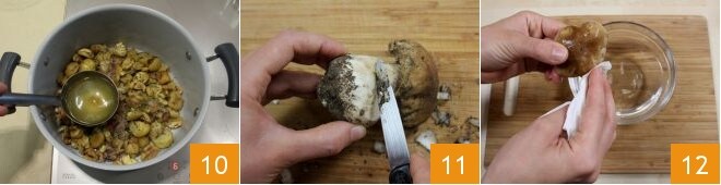 Lasse sie 2 Minuten anbraten und gieße dann die vorbereitete Gemüsebrühe über die Kastanien, sodass sie gut bedeckt sind 10: Bewahre einen Teil davon auf und füge ihn hinzu, falls die Brühe austrocknet. Lasse sie bei starker Hitze 15-20 Minuten kochen und kümmere dich in der Zwischenzeit um die Reinigung der Wie man Steinpilze putzt: Entferne mit einem scharfen Messer mit glatter Klinge den erdigen Teil am Stiel, indem du ihn vorsichtig abkratzt, bis alle Erdspuren entfernt sind 11. Wenn die Pilze einigermaßen sauber sind, entferne die wenigen Erdreste mit einem Pinsel oder einem Baumwolltuch 12, wenn sie hingegen noch sehr schmutzig sind, spüle sie kurz unter fließendem kaltem Wasser ab.