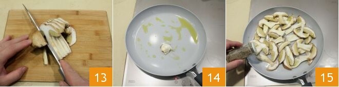 Nach der Reinigung schneide die ganzen Pilze der Länge nach 13. Brate eine Knoblauchzehe in der Schale in einer beschichteten Pfanne mit dem Öl an 14, dann lasse die Pilze 10 Minuten anbraten, würze mit Salz und Pfeffer 15.