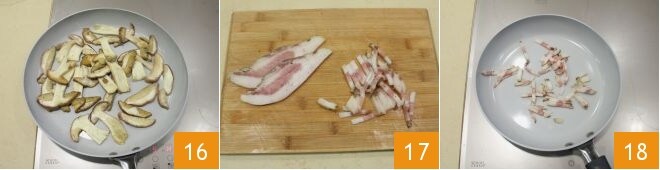 Wenn die Pilze fertig sind, schalte aus und stelle sie beiseite 16. Schneide den Schweinebacke in Scheiben und dann in Streifen 17, brate ihn dann für einige Minuten auf dem Herd, um das Fett zu entfernen und ihn knusprig zu machen 18.
