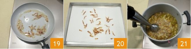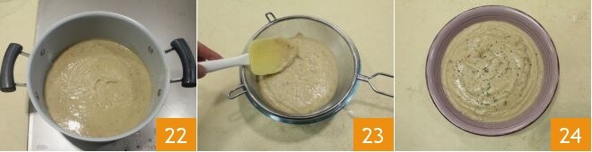 bis eine dicke Creme entsteht 22. Siebe die Samtsuppe nun durch ein feines Sieb, bis eine glatte und homogene Creme entsteht 23; fülle sie auf einen Servierteller um, garniere sie mit den vorbereiteten Pilzen und dem knusprigen Schweinebacke. Ihre köstliche Samtsuppe aus Kastanien mit Steinpilzen und knusprigem Schweinebacke ist fertig: Genießen Sie sie sofort 24!