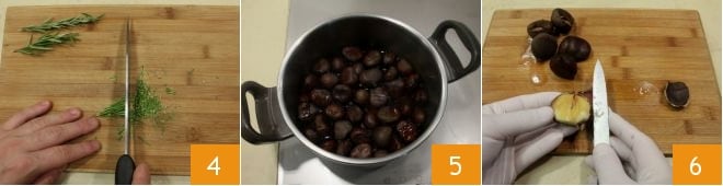 Hacke den Rosmarin fein 4 und stelle ihn beiseite. Wenn die Kastanien fertig sind 5, ziehe Latexhandschuhe an und schäle sie mit einem kleinen Messer, während sie noch heiß sind, indem du sie einzeln aus ihrer Kochflüssigkeit nimmst, während du sie reinigst 6.