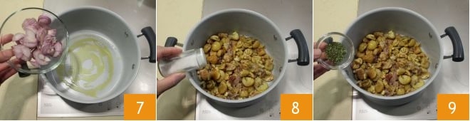 Nach diesem Vorgang brate die Schalotte bei mittlerer Hitze in einer beschichteten Pfanne mit dem Öl an und rühre gut mit einem Spatel um 7. Stelle die zuvor gereinigten Kastanien auf den Herd, füge nach Belieben Salz und Pfeffer hinzu 8 zusammen mit dem gehackten Rosmarin 9.