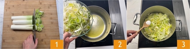 Um die Lauchcremesuppe zuzubereiten, beginnen Sie damit, den Lauch zu putzen und die Herzen in dünne Scheiben zu schneiden 1; bewahren Sie den grünen Teil auf, den Sie zum Anrichten benötigen. Geben Sie den Lauch in einen Topf mit etwas Öl 2 und fügen Sie sofort etwas Salz hinzu, um die Flüssigkeitsabgabe zu fördern 3. Rühren Sie gelegentlich um und lassen Sie alles kochen.