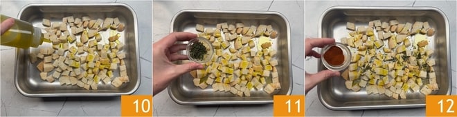 Legen Sie die Brotwürfel auf ein Backblech, dann würzen Sie sie mit Öl 10, gehacktem Rosmarin und Salbei 11 und edelsüßem Paprika 12.