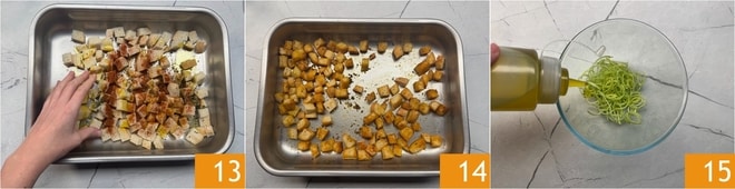 Massieren Sie gut mit den Händen, um alles gleichmäßig zu würzen 13 und backen Sie die Croutons im statischen Ofen bei 200° für 10 Minuten 14. In der Zwischenzeit würzen Sie den grünen Teil des Lauchs, den Sie beiseitegelegt hatten, mit Öl und Salz 15 und rühren Sie um.