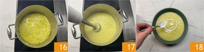 Zu diesem Zeitpunkt sind die Kartoffeln und der Lauch gekocht 16, pürieren Sie sie mit einem Stabmixer für mindestens eine Minute, um eine seidige Konsistenz zu erzielen, geben Sie bei Bedarf wenig Wasser hinzu 17. Schließlich mit Salz abschmecken. Anrichten, indem Sie die Oberfläche mit einem Faden Joghurt garnieren 18.