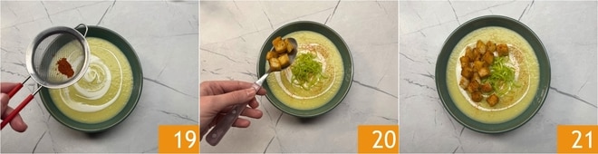 Vervollständigen Sie die Teller mit einer Prise Paprika 19, dem grünen Lauch, einem Faden Öl und den Brotwürfeln 20. Ihre Lauchcremesuppe mit würzigen Croutons ist bereit zum Servieren 21!