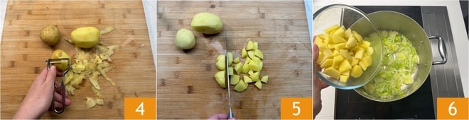 In der Zwischenzeit widmen Sie sich den Kartoffeln: schälen Sie sie 4 und schneiden Sie sie in 1,5 cm große Würfel 5, dann geben Sie sie zusammen mit dem Lauch in den Topf 6.