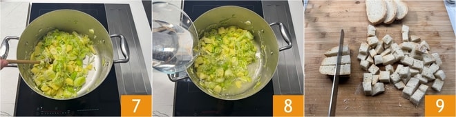 Gut umrühren und ein paar Minuten köcheln lassen 7, dann mit Wasser bedecken 8 und etwa 25 Minuten bei mittlerer bis niedriger Hitze kochen lassen. In der Zwischenzeit schneiden Sie das Brot in 1,5 cm große Würfel 9.