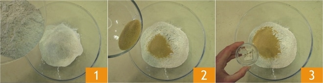 Um die Vollkornhörnchen mit Honig zuzubereiten, beginnen Sie mit dem Teig. Die Butter, die dem Teig hinzugefügt wird, sollte weich sein, stellen Sie also sicher, dass Sie sie mindestens eine Stunde vorher aus dem Kühlschrank nehmen, wenn nicht länger. In einer Schüssel das Manitoba-Mehl Typ 1 und das Vollkornmehl in einer Schüssel 1, den braunen Zucker 2 und die Hefe 3 mischen.