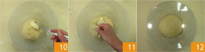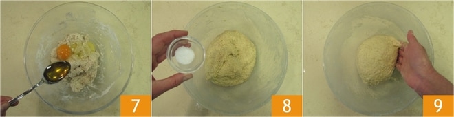 Fügen Sie auch den Honig hinzu 7 und kneten Sie weiter. Wenn das Ei und der Honig gut aufgenommen sind, fügen Sie das Salz hinzu 8 und arbeiten Sie noch ein paar Minuten 9, bis es vollständig aufgenommen ist.