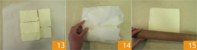 In der Zwischenzeit die Butter für das Blättern vorbereiten: die Butter aus dem Kühlschrank nehmen und 5 Minuten bei Raumtemperatur stehen lassen, dann in der Mitte eines 20x20 cm großen Quadrats Backpapier positionieren (13-14). Die Butter mit dem Nudelholz auf eine Dicke von etwa einem halben Zentimeter ausrollen 15. Das Butterplättchen im Kühlschrank aufbewahren, bis es benötigt wird.