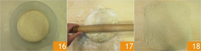 Nach der Gehzeit 16 den Teig auf einer leicht bemehlten Arbeitsfläche ausrollen 17, um ein Quadrat von 40x40 cm zu erhalten 18.