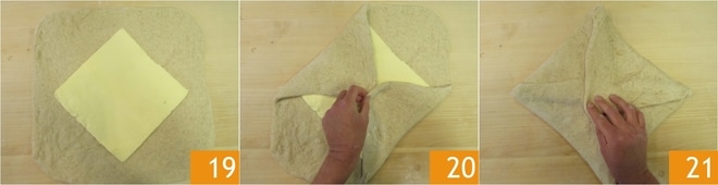 Das Butterplättchen in der Mitte des Quadrats platzieren, um eine Raute zu bilden 19, und das Backpapier entfernen. Die Ecken des unteren Quadrats zur Mitte des Butterplättchens falten 20, dabei darauf achten, die Kanten zusammenzuführen, ohne sie zu überlappen. Die Ränder mit den Fingern versiegeln 21 und 10-15 Minuten im Kühlschrank ruhen lassen.