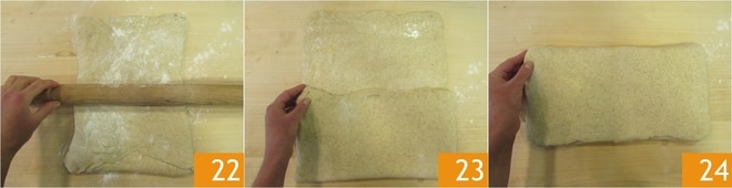 Nach dieser Zeit das entstandene Quadrat auf der leicht bemehlten Arbeitsfläche positionieren und mit dem Nudelholz einen der Seiten verlängern, bis ein Rechteck von 50x30 cm entsteht 22. Fahren Sie mit der ersten 3er-Faltung fort: den unteren Rand bis zu einem Drittel des Rechtecks falten 23, dann den oberen Rand überlappen 24. Den so entstandenen Block mit Folie abdecken und mindestens 30 Minuten im Kühlschrank ruhen lassen.
