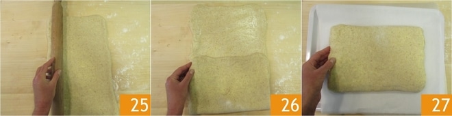 Nach dieser Zeit den Block erneut ausrollen, um ein Rechteck mit den gleichen Abmessungen wie das vorherige zu erhalten 25. Mit der zweiten 3er-Faltung fortfahren, indem der untere Rand 26 und dann der obere Rand 27 gefaltet wird. Den Block in Folie einwickeln und weitere 30 Minuten im Kühlschrank ruhen lassen.