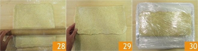 Nach dieser Zeit mit der dritten und letzten 3er-Faltung fortfahren: den Block erneut ausrollen, um ein Rechteck gleicher Größe zu formen 28, den oberen 29 und unteren Rand falten, mit Folie abdecken 30 und im Kühlschrank ruhen lassen, diesmal für etwa 60 Minuten.