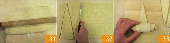 Nach dieser Zeit den Block ausrollen, um ein Rechteck von 80x25 cm mit einer Dicke von etwa einem halben Zentimeter zu erhalten 31 und Dreiecke mit einer Basis von 10 cm und einer Höhe von 25 cm ausschneiden 32. Jedes Dreieck von der Basis aus aufrollen, um 2 vollständige Runden zu bilden, dabei darauf achten, den Teig nicht zu quetschen oder zu stark zu ziehen 33.