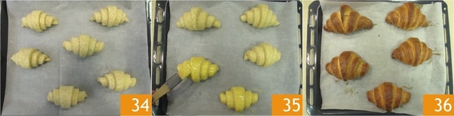 Die so geformten Hörnchen auf ein mit Backpapier ausgelegtes Blech legen und sie gut voneinander abstandhalten; so erhalten Sie 10 Hörnchen mit jeweils 3 Windungen 34. Eine Stunde bei Raumtemperatur vor Zugluft geschützt gehen lassen. Nach dem Gehen die Hörnchen mit der Mischung aus Eigelb und Sahne bestreichen 35 und in einem vorgeheizten Umluftofen bei 180° für 25 Minuten backen, dabei darauf achten, den Ofen nicht zu öffnen und den Backvorgang zu überwachen. Wenn sie schön goldbraun sind, aus dem Ofen nehmen und abkühlen lassen 36.