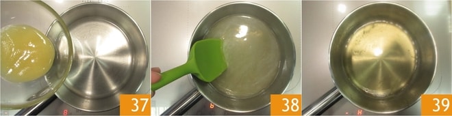 In der Zwischenzeit den Honigsirup vorbereiten: Wasser und Honig in einen kleinen Topf gießen 37 und zum Kochen bringen 38, dann die Hitze ausschalten und abkühlen lassen 39.