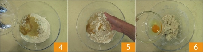 Gießen Sie das Wasser bei Zimmertemperatur hinzu 4 und beginnen Sie, mit den Händen zu kneten, bis das Mehl vollständig aufgenommen ist 5, dann fügen Sie das Ei hinzu 6.
