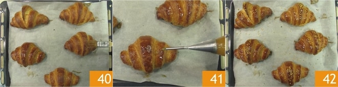 Die Hörnchen mit dem Sirup bestreichen 40 und mit Lindenblütenhonig füllen, indem Sie eine Spritze für Süßigkeiten verwenden 41. Mit Pollenkörnern garnieren und Ihre Vollkornhörnchen mit Honig sind bereit zum Genießen 42!