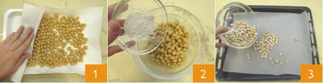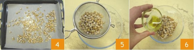 und backen Sie sie bei 170 Grad für 20 Minuten, bis sie goldbraun und knusprig sind 4. Geben Sie sie dann in ein feines Sieb und schütteln Sie es, um den Kichererbsen das überschüssige Mehl zu entziehen 5. Transferieren Sie sie in eine kleine Schüssel und würzen Sie sie mit dem Öl 6