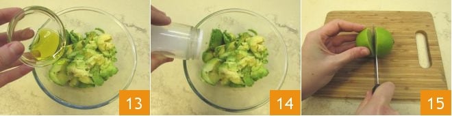 Mit Öl 13 und Salz 14 würzen. Schneiden Sie die Limette in zwei Hälften 15
