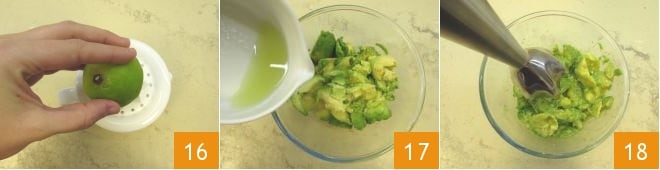 Und pressen Sie sie aus, um den Saft zu gewinnen 16. Geben Sie den Saft in die Schüssel mit der Avocado 17 und pürieren Sie schließlich alles mit einem Stabmixer zu einer feinen Creme 18.