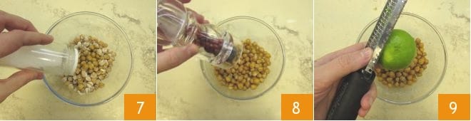 dem Salz 7, dem gemahlenen rosa Pfeffer 8 und der Limettenschale 9. Mischen Sie alles und halten Sie es warm.