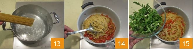 Kocht nun die Vollkornspaghetti 13 und seiht sie am Ende der Kochzeit direkt in die Pfanne mit der Sauce ab 14. Gebt den Rucola und den Feta dazu 15.
