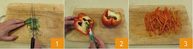 Um die Vollkornspaghetti mit roten Paprika, Rucola und Feta zuzubereiten, fangt an, die Gewürze und das Gemüse zu waschen und zu trocknen. Hackt dann fein Thymian, Salbei und Rosmarin 1 und schneidet die Paprika in zwei Hälften. Entfernt den grünen Stiel 2 und die weißen Fäden 2 sowie die inneren Samen. Schneidet sie schließlich in dünne Streifen 3 und stellt sie beiseite.