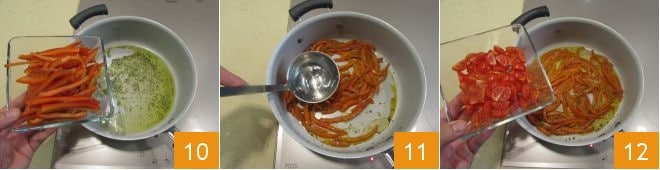 Gebt auch die Paprika dazu 10 und lasst sie bei mittlerer Hitze etwa 12-13 Minuten kochen, indem ihr eine Kelle heißes Wasser hinzufügt, um das Garen zu erleichtern 11. Dann fügt die Kirschtomaten hinzu 12, würzt mit Salz und Pfeffer und lasst sie weitere 2 Minuten kochen. Rührt die Zutaten weiter, um ein gleichmäßiges Garen zu fördern.